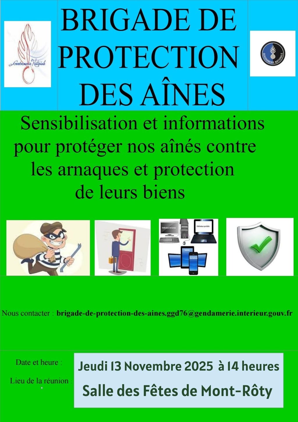 Nous vous invitons les Ainés à venir nombreux à cette réunion afin de bénéficier des conseils de la Brigade de Protection des Ainés pour se protéger des arnaques et, s'informer sur la protection de leurs biens.